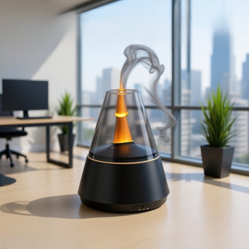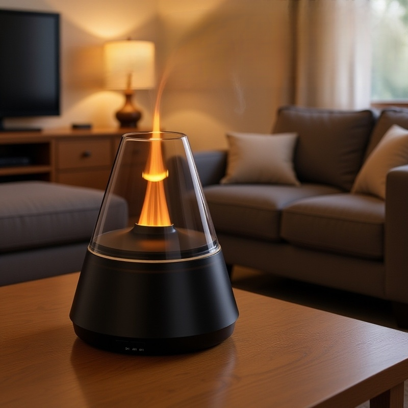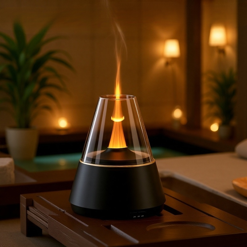 ● 炎のような幻想的なライト効果で、お部屋に癒しの雰囲気を演出しながら加湿ができるデスクトップ型アロマディフューザーです。